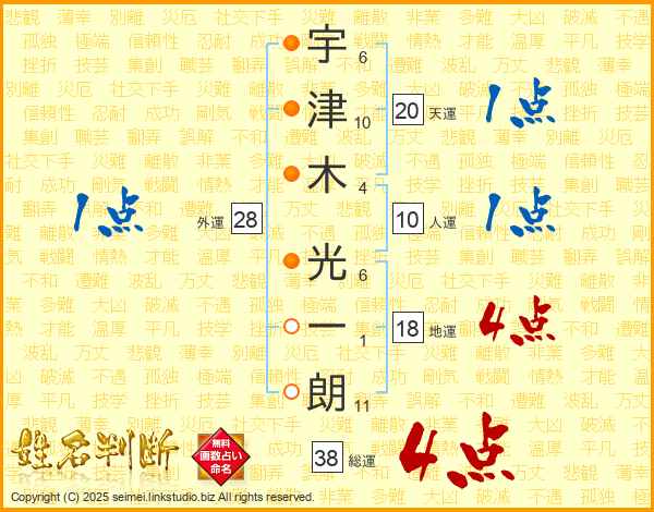 宇(6画)津(10画)木(4画) 光(6画)一(1画)朗(11画)
