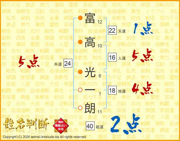 富(12画)高(10画) 光(6画)一(1画)朗(11画)