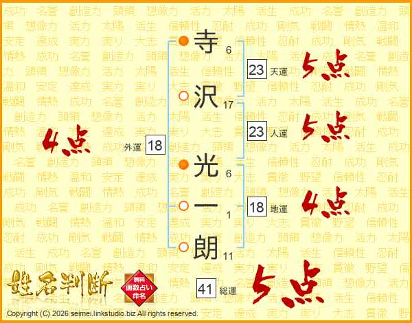 寺(6画)沢(17画) 光(6画)一(1画)朗(11画)