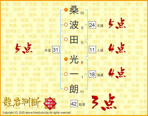 桑(10画)波(9画)田(5画) 光(6画)一(1画)朗(11画)
