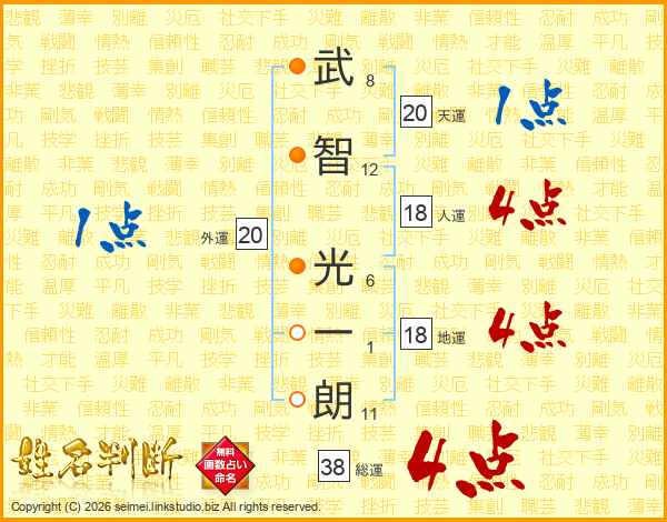 武(8画)智(12画) 光(6画)一(1画)朗(11画)