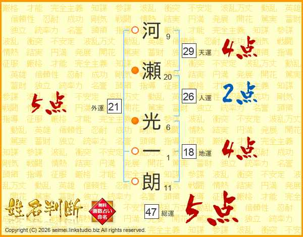 河(9画)瀬(20画) 光(6画)一(1画)朗(11画)