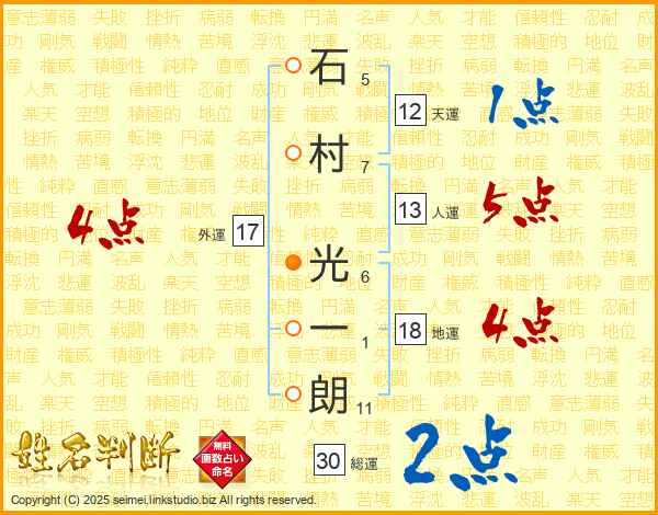 石(5画)村(7画) 光(6画)一(1画)朗(11画)