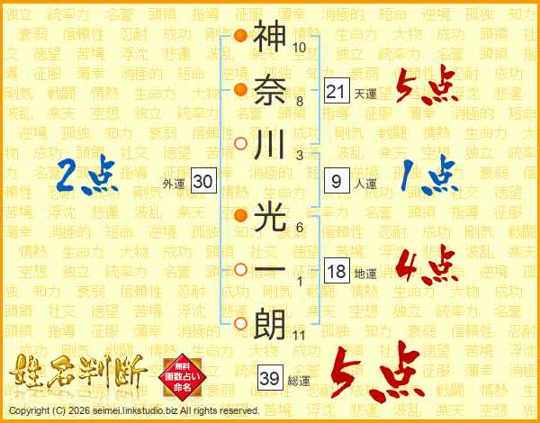 神(10画)奈(8画)川(3画) 光(6画)一(1画)朗(11画)