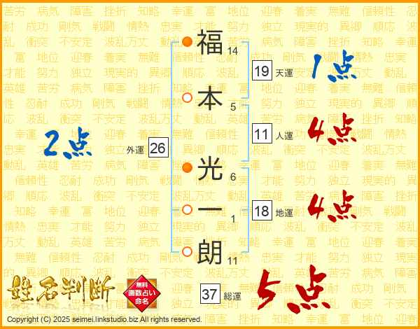 福(14画)本(5画) 光(6画)一(1画)朗(11画)