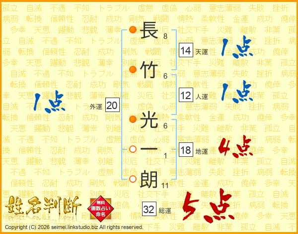 長(8画)竹(6画) 光(6画)一(1画)朗(11画)