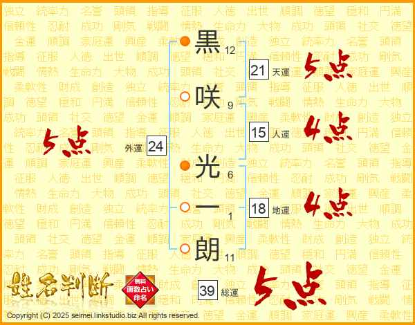黒(12画)咲(9画) 光(6画)一(1画)朗(11画)