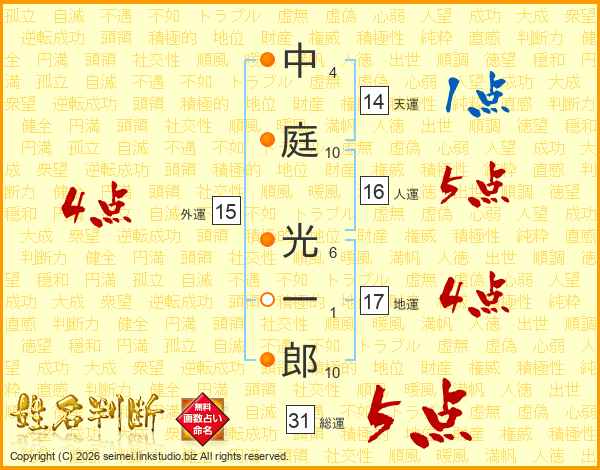 中(4画)庭(10画) 光(6画)一(1画)郎(10画)