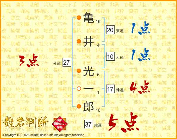 亀(16画)井(4画) 光(6画)一(1画)郎(10画)