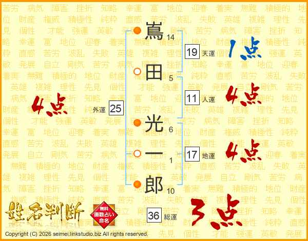 嶌(14画)田(5画) 光(6画)一(1画)郎(10画)