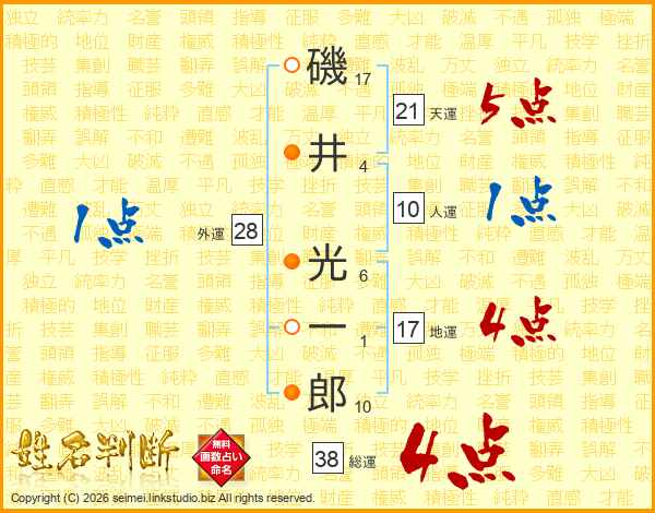 磯(17画)井(4画) 光(6画)一(1画)郎(10画)