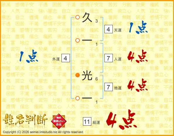 生活面を象徴する運勢です。外部から受ける影響力を表し、結婚運、家庭運や職場、環境への順応性を表します。総運から人運を引いた画数。姓や名が1文字の場合を除く。
