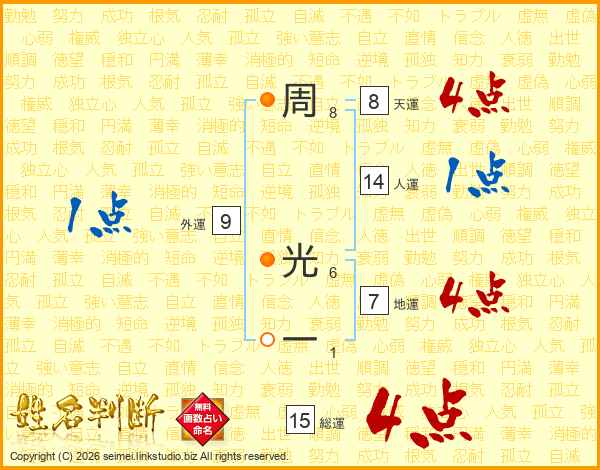 生活面を象徴する運勢です。外部から受ける影響力を表し、結婚運、家庭運や職場、環境への順応性を表します。総運から人運を引いた画数。姓や名が1文字の場合を除く。