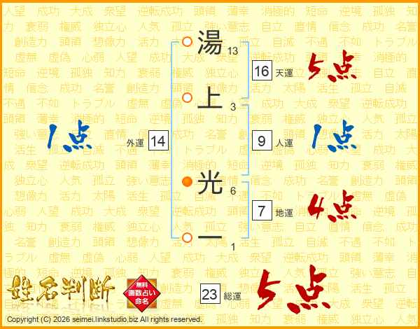 生活面を象徴する運勢です。外部から受ける影響力を表し、結婚運、家庭運や職場、環境への順応性を表します。総運から人運を引いた画数。姓や名が1文字の場合を除く。