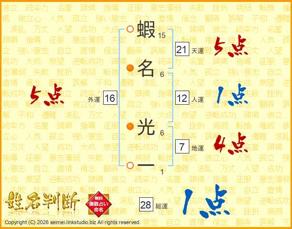 生活面を象徴する運勢です。外部から受ける影響力を表し、結婚運、家庭運や職場、環境への順応性を表します。総運から人運を引いた画数。姓や名が1文字の場合を除く。