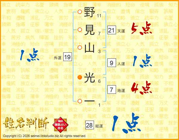 野(11画)見(7画)山(3画) 光(6画)一(1画)