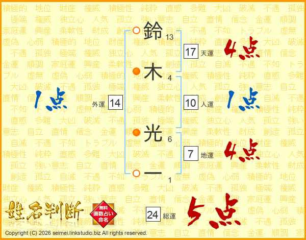 生活面を象徴する運勢です。外部から受ける影響力を表し、結婚運、家庭運や職場、環境への順応性を表します。総運から人運を引いた画数。姓や名が1文字の場合を除く。