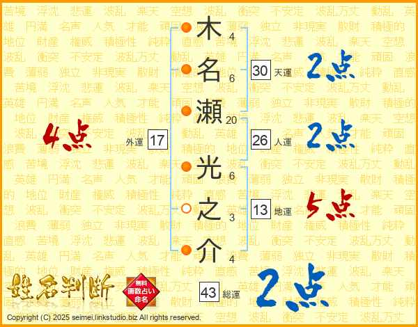 木(4画)名(6画)瀬(20画) 光(6画)之(3画)介(4画)