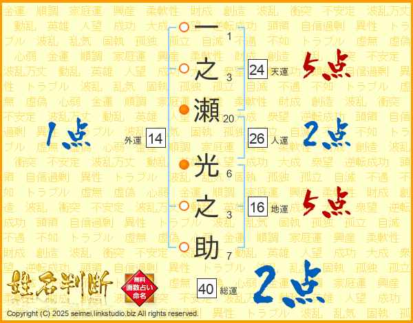 一(1画)之(3画)瀬(20画) 光(6画)之(3画)助(7画)