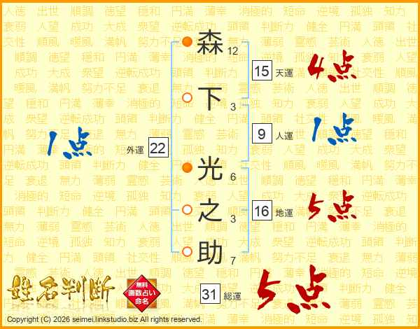森(12画)下(3画) 光(6画)之(3画)助(7画)