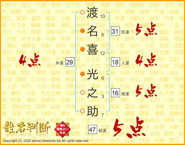 渡(13画)名(6画)喜(12画) 光(6画)之(3画)助(7画)