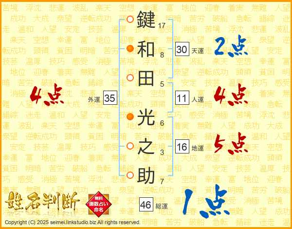 鍵(17画)和(8画)田(5画) 光(6画)之(3画)助(7画)