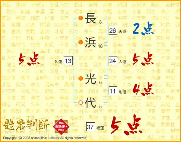 あなたの人生を表す1番重要な運勢です。生涯を通じて影響する総合運となり、主に50歳以降の晩年期に影響を及ぼします。苗字と名前の合計画数。