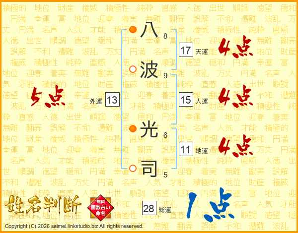 生活面を象徴する運勢です。外部から受ける影響力を表し、結婚運、家庭運や職場、環境への順応性を表します。総運から人運を引いた画数。姓や名が1文字の場合を除く。