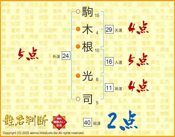 駒(15画)木(4画)根(10画) 光(6画)司(5画)