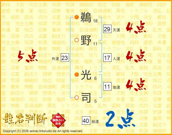 鵜(18画)野(11画) 光(6画)司(5画)