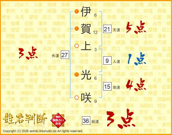 伊(6画)賀(12画)上(3画) 光(6画)咲(9画)