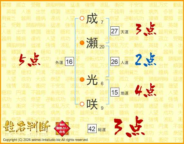 成(7画)瀬(20画) 光(6画)咲(9画)