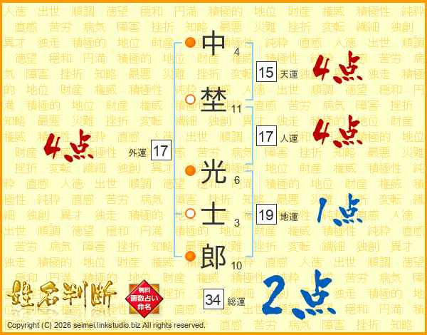 中(4画)埜(11画) 光(6画)士(3画)郎(10画)