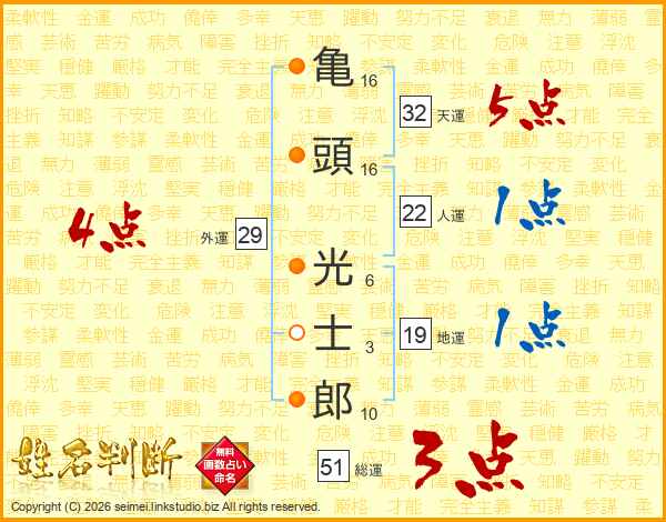 亀(16画)頭(16画) 光(6画)士(3画)郎(10画)