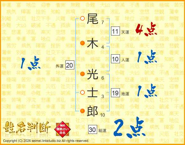 尾(7画)木(4画) 光(6画)士(3画)郎(10画)