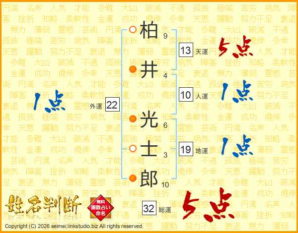 柏(9画)井(4画) 光(6画)士(3画)郎(10画)