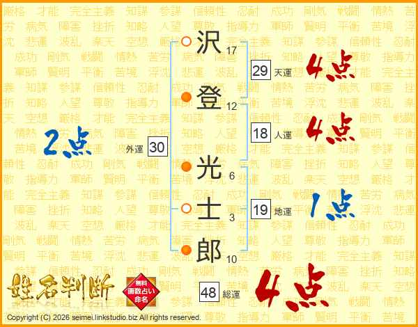 沢(17画)登(12画) 光(6画)士(3画)郎(10画)