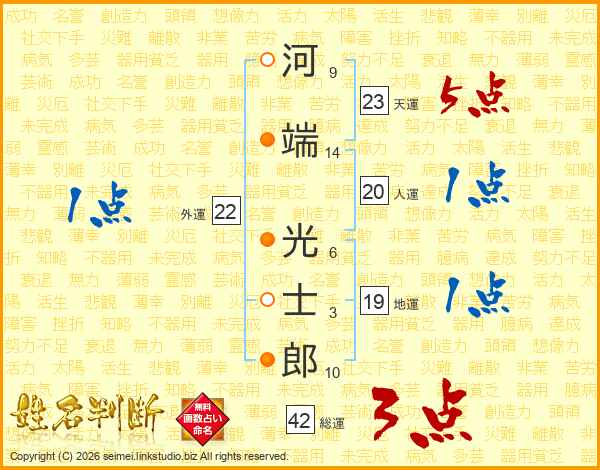 河(9画)端(14画) 光(6画)士(3画)郎(10画)