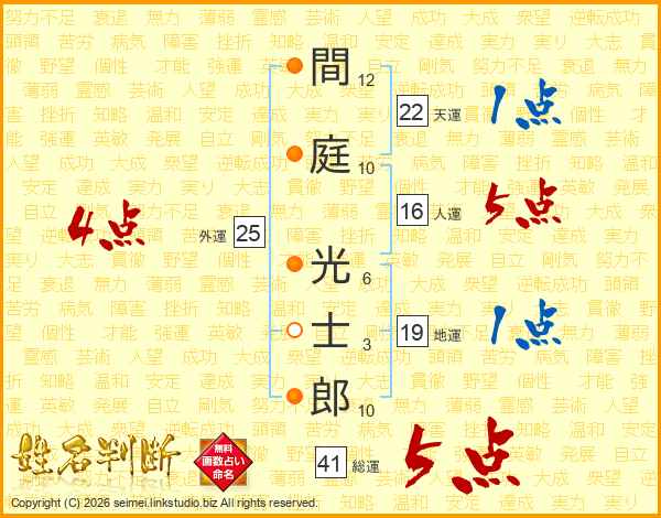 間(12画)庭(10画) 光(6画)士(3画)郎(10画)