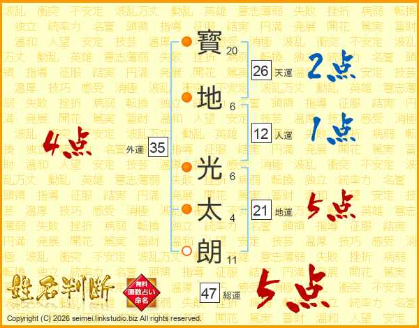 寳(20画)地(6画) 光(6画)太(4画)朗(11画)