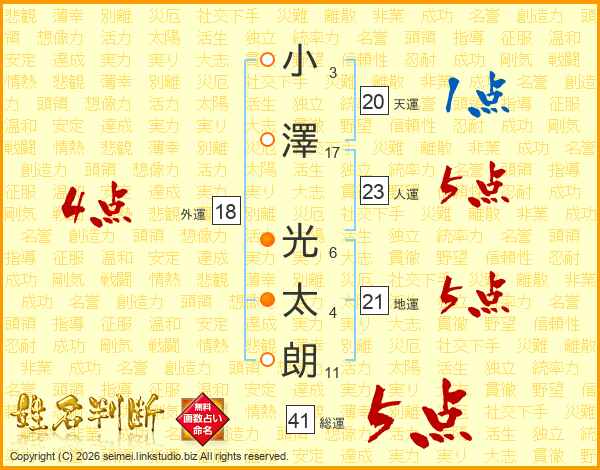 小(3画)澤(17画) 光(6画)太(4画)朗(11画)
