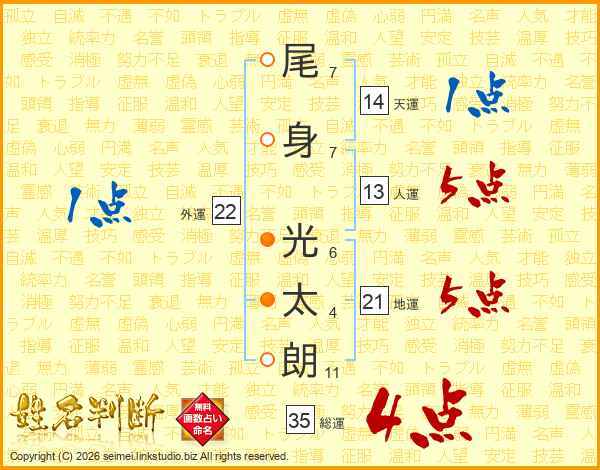尾(7画)身(7画) 光(6画)太(4画)朗(11画)