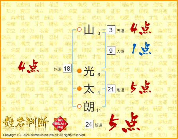 あなたの人生を表す1番重要な運勢です。生涯を通じて影響する総合運となり、主に50歳以降の晩年期に影響を及ぼします。苗字と名前の合計画数。