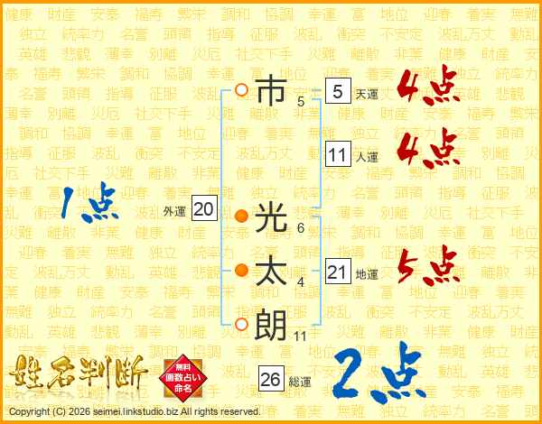 あなたの人生を表す1番重要な運勢です。生涯を通じて影響する総合運となり、主に50歳以降の晩年期に影響を及ぼします。苗字と名前の合計画数。