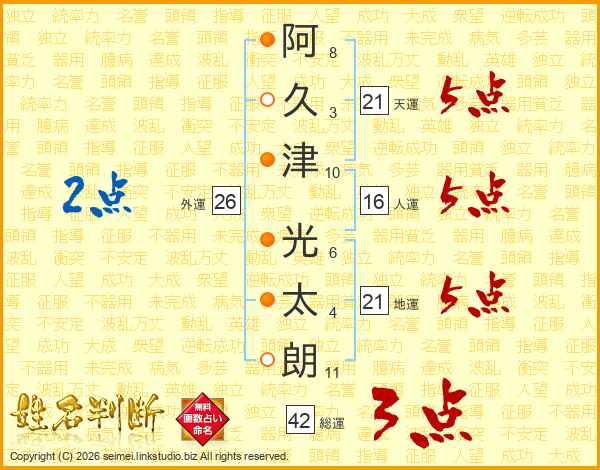 阿(8画)久(3画)津(10画) 光(6画)太(4画)朗(11画)