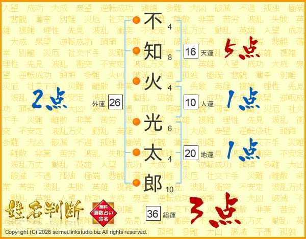 不(4画)知(8画)火(4画) 光(6画)太(4画)郎(10画)