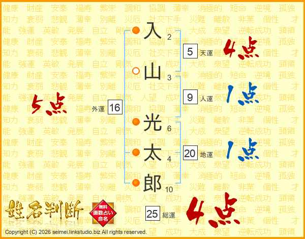 入(2画)山(3画) 光(6画)太(4画)郎(10画)