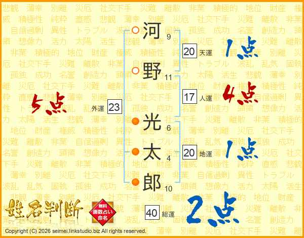 河(9画)野(11画) 光(6画)太(4画)郎(10画)