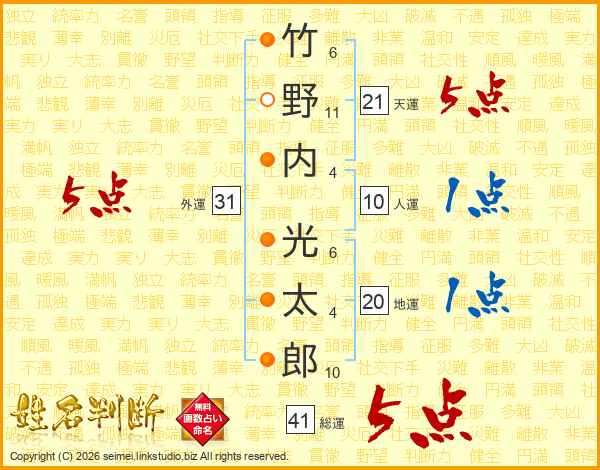 竹(6画)野(11画)内(4画) 光(6画)太(4画)郎(10画)
