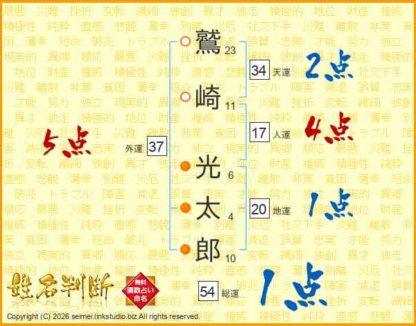 鷲(23画)崎(11画) 光(6画)太(4画)郎(10画)